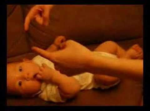 This little girl understands the fun in the game!. She can grab on to Mom's fingers and pull up. It is best to play this game on the couch or something soft, in case baby loses her grip.