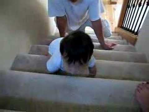 Teaching babies to be safe on stairs takes patience. It is faster just to carry the kid up, but this mom and dad are doing it right by taking the time to let him learn to do it himself. Soon they will have trouble keeping up with him.