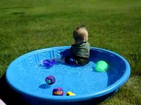 Splash,splash, splash. This little guy wouldn't even need the toys. Splashing in the pool seems like it will keep him happy until most of the water is gone. Maybe Mom or Dad can show him how the toys make a splash later when he is interested in them.