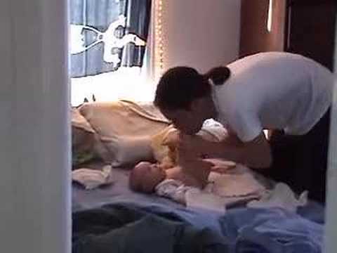 This dad has found a way to entertain his baby. She might not be able to play for very long, but she seems to really like looking at daddy, hearing the music he makes and feeling what he is doing with her feet.